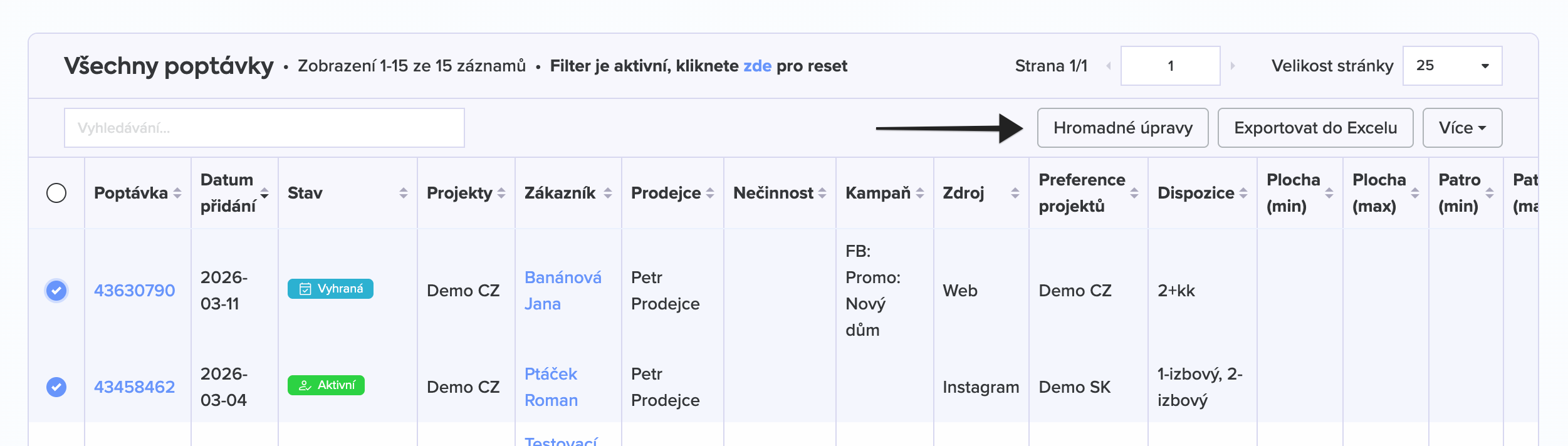 Potřebujete hromadně změnit stav u několika poptáávek, nebo změnit prodejce? Není problém! Díky tlačítku **Hromadné úpravy** ušetříte hromadu času.